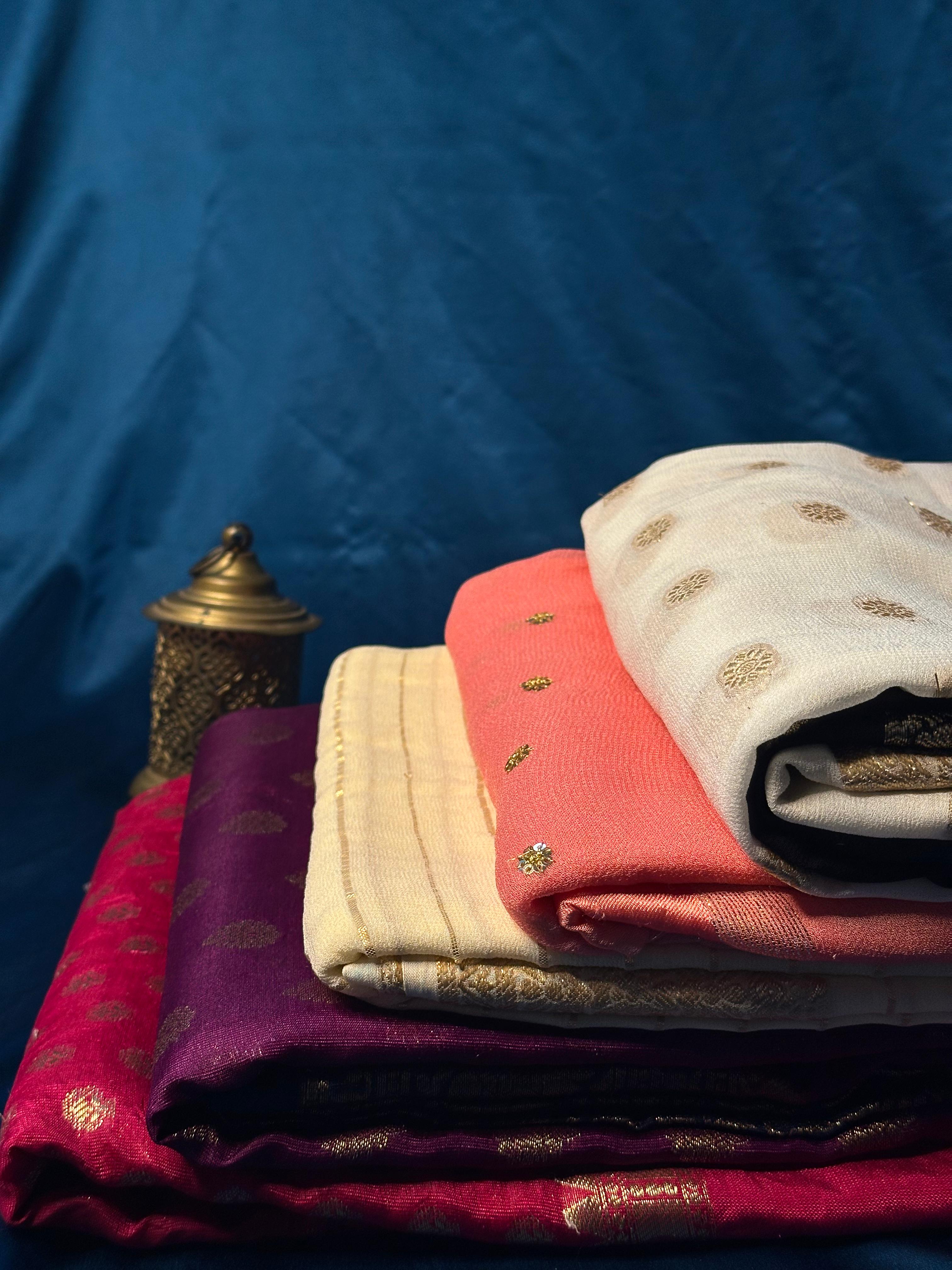 Silk - For family gatherings requiring tradition, silk or Kanchipuram sarees are recommended. They're rich-feeling and well-suited for weddings or cultural occasions.