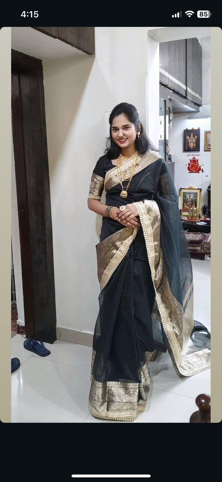 Elevate your ethnic wardrobe with this stunning black Banarasi saree. Crafted from luxurious tissue silk with intricate designer lace detailing, it's perfect for weddings and special occasions. A timeless piece that celebrates traditional craftsmanship.