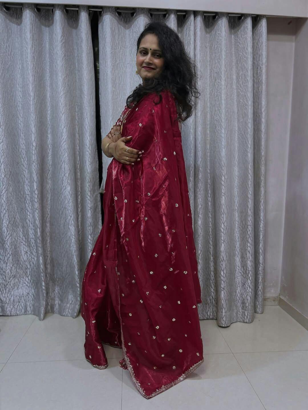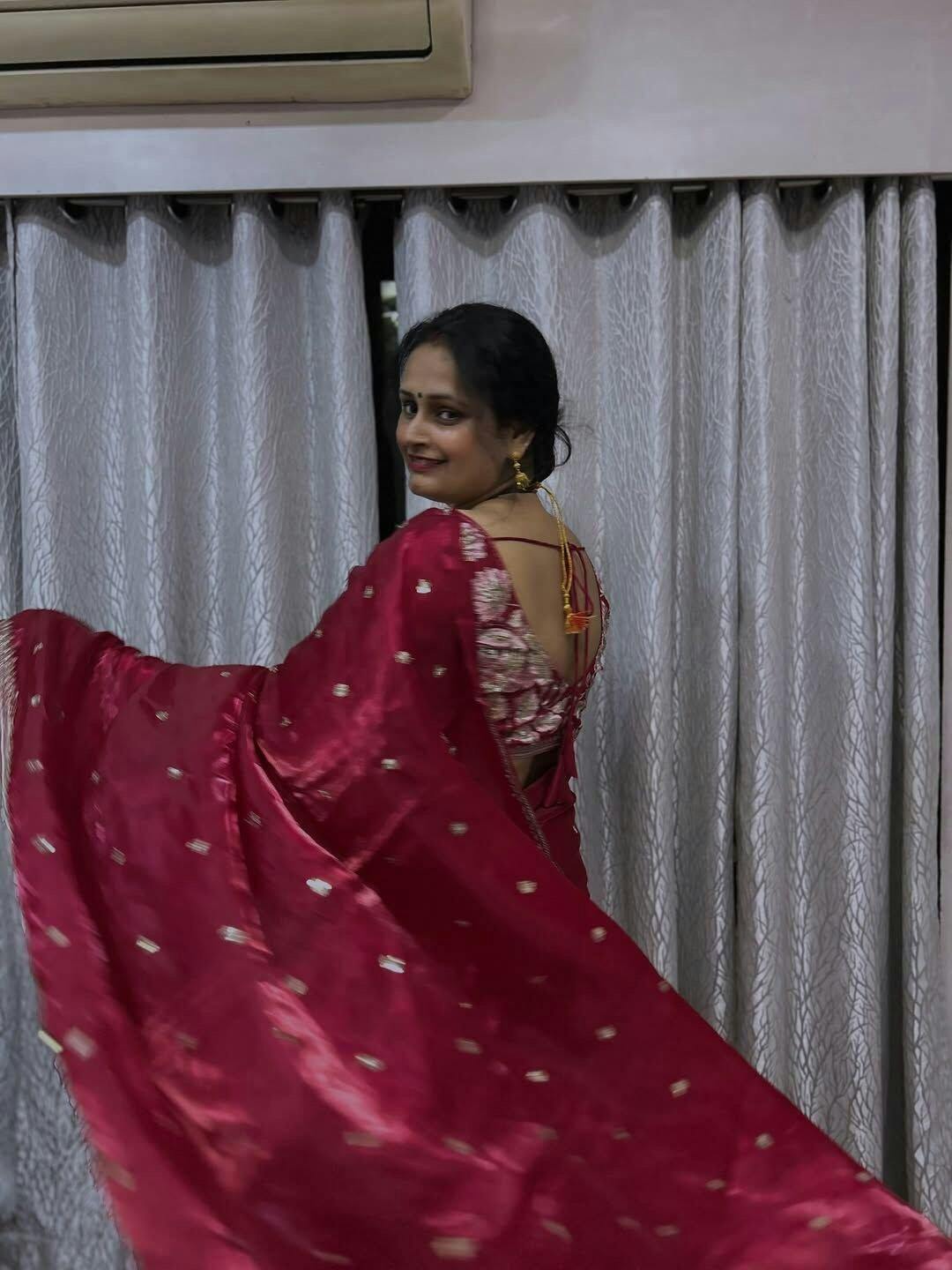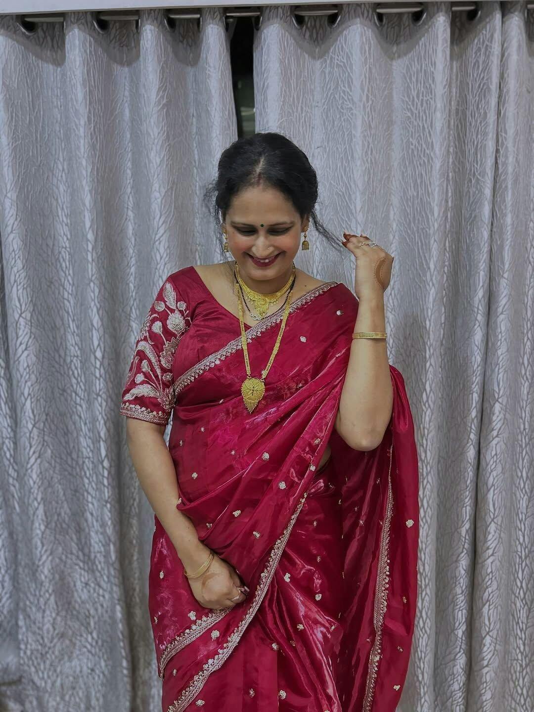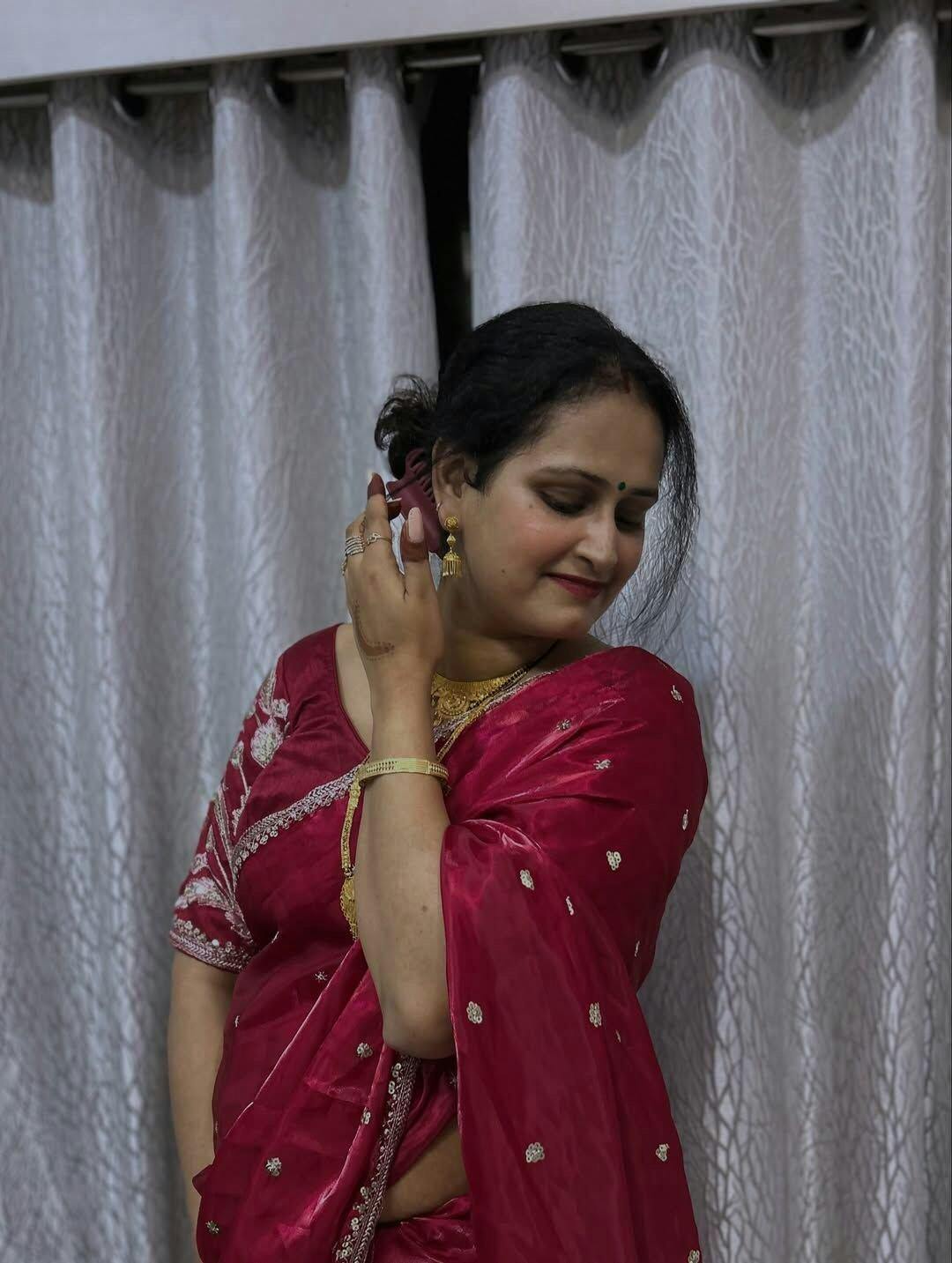 Make your special moments unforgettable with this exquisite bridal red shade shimmery tissue silk saree. This saree is designed to radiate elegance and features luxurious tissue silk fabric with a stunning shimmer that adds a timeless charm.The deep red hue, symbolic of weddings and celebrations, complements intricate weaving patterns, making it a perfect choice for brides and festive occasions. Its lightweight yet rich texture ensures both comfort and sophistication.Whether you're attending a wedding, a grand celebration, or a traditional event, this saree effortlessly enhances your look. Pair it with statement jewelry to complete your regal ensemble.