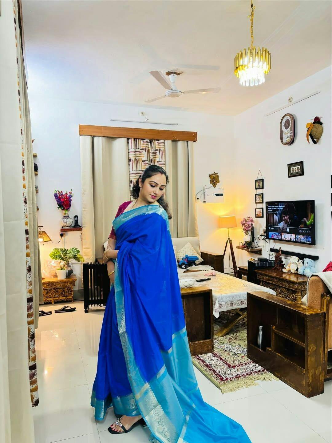 Contrast Royal Blue Mysore Crepe Silk Banarasi Saree