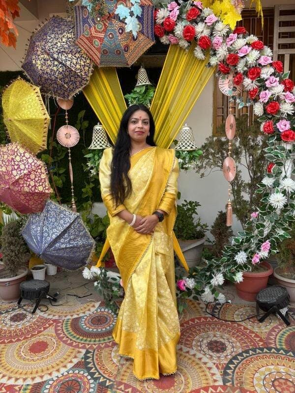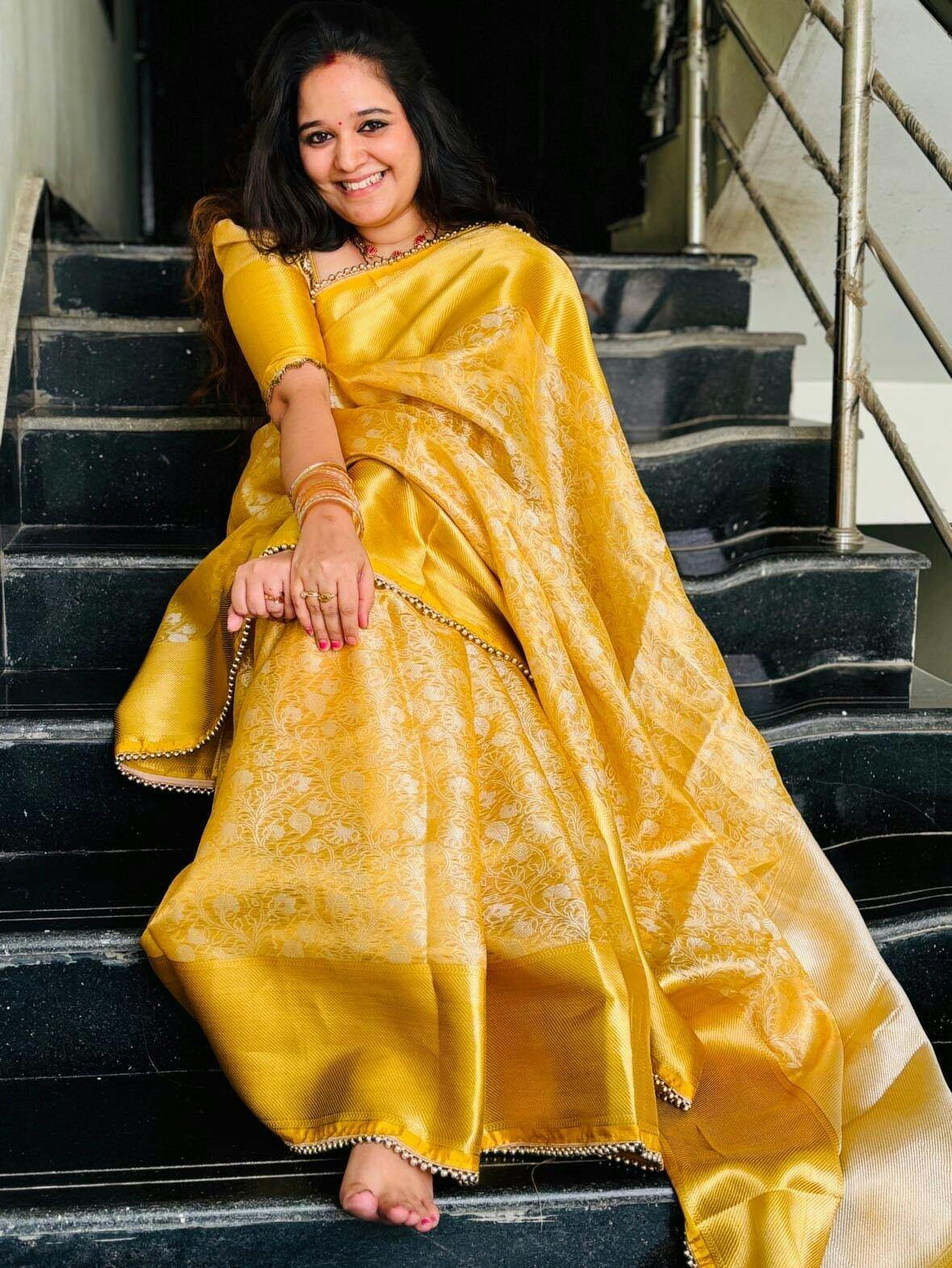 Make a lasting impression with this Light Golden Kanjeevaram Tissue Silk Moti Less Attached Banarasi Saree, crafted for moments that matter. Made from premium tissue silk, it features a rich embossed floral weave that reflects timeless tradition and refined elegance. The saree’s lightweight texture offers effortless draping, while moti-less lace detailing and an embroidered blouse complete the sophisticated look. Ideal for weddings, festive occasions, and grand celebrations.