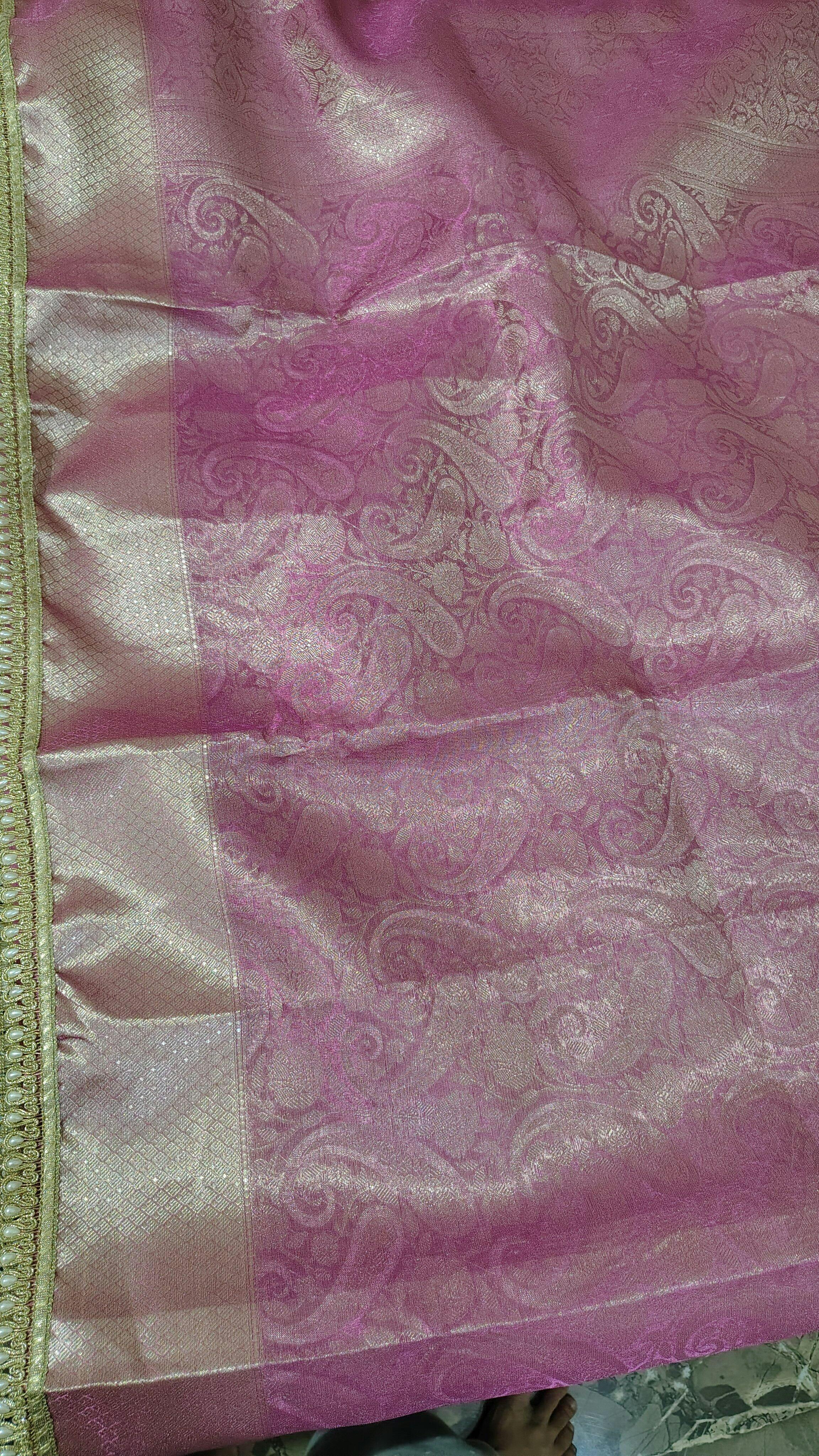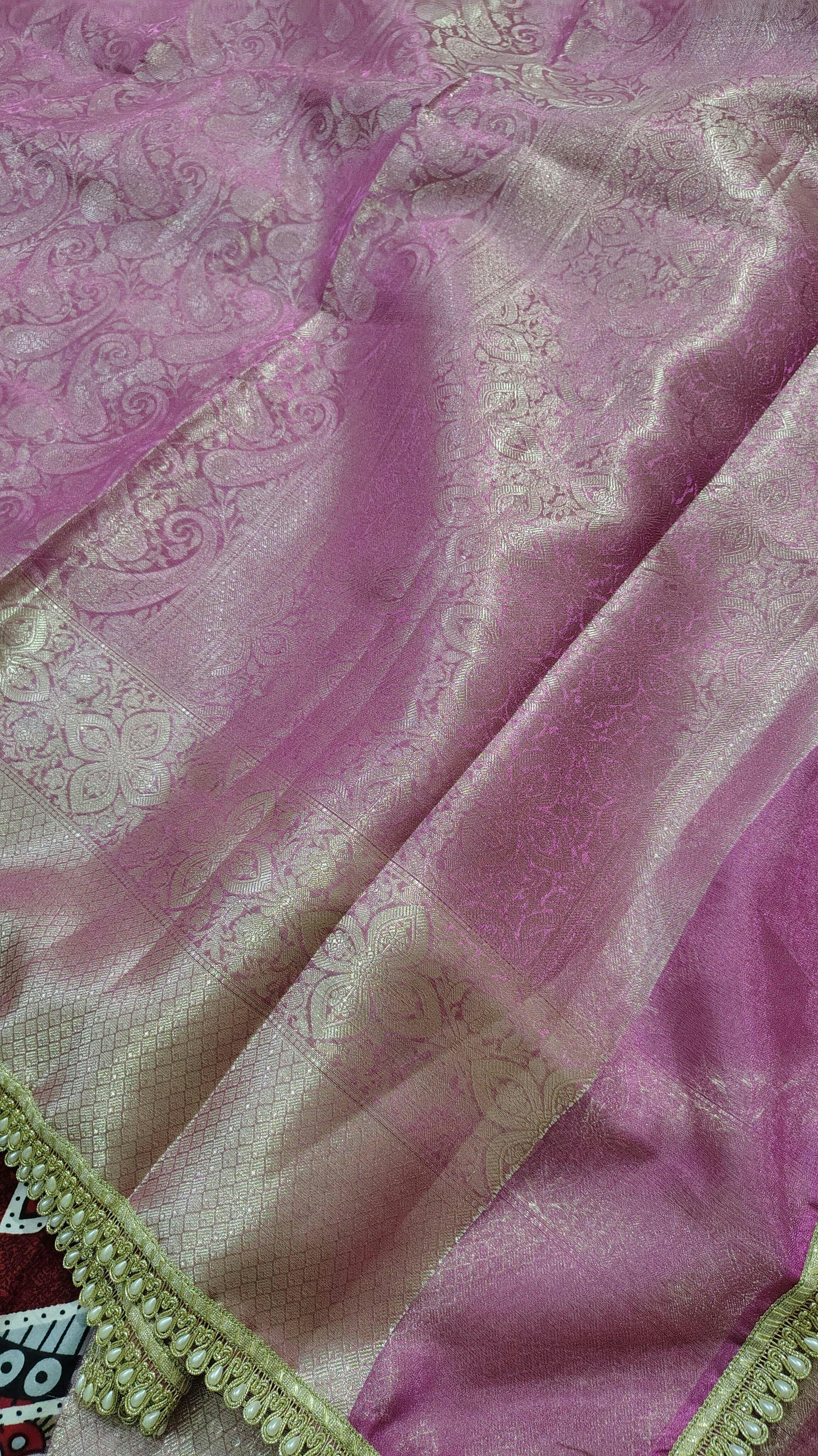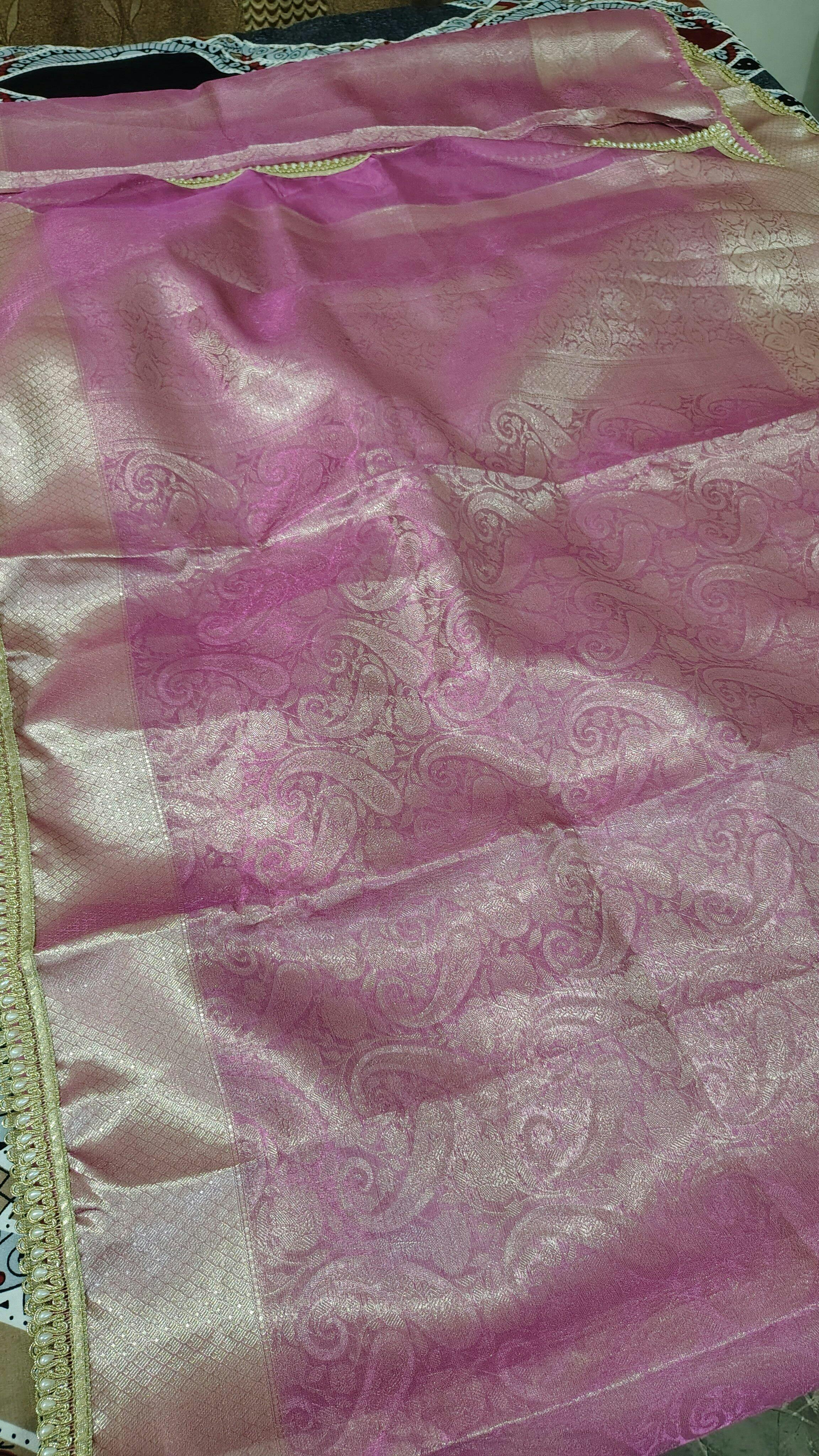 Pink Glass Tissue Silk Designer Lace Work Banarasi Saree