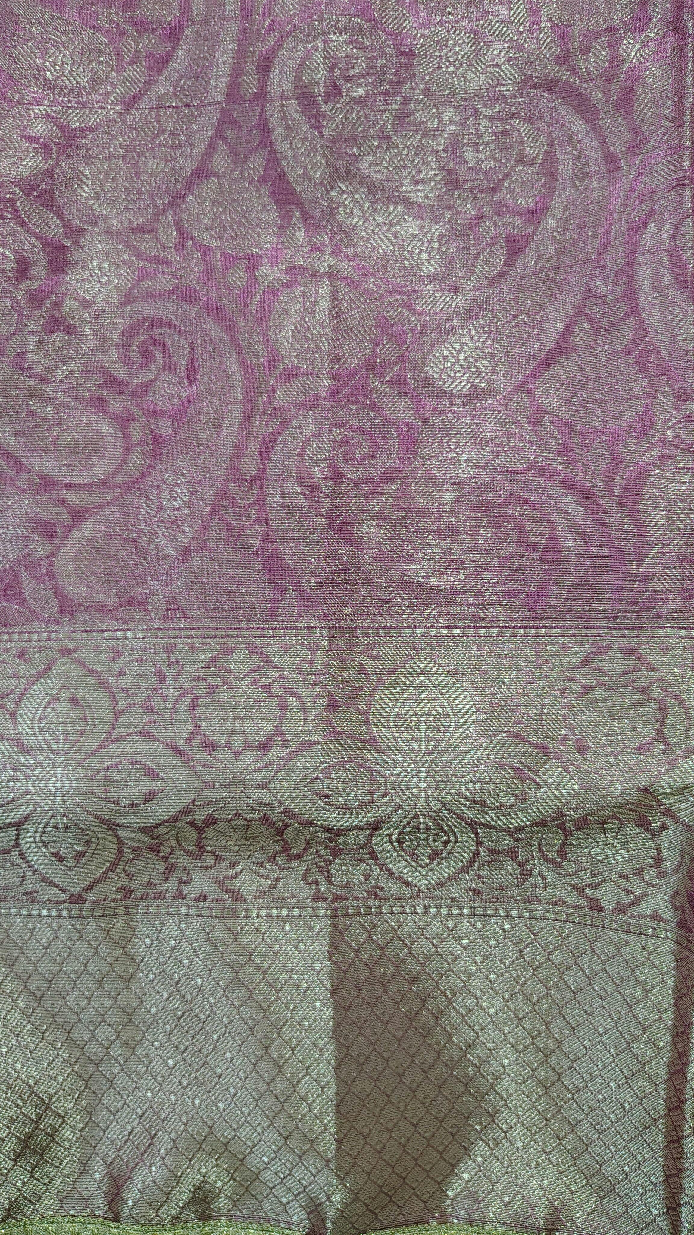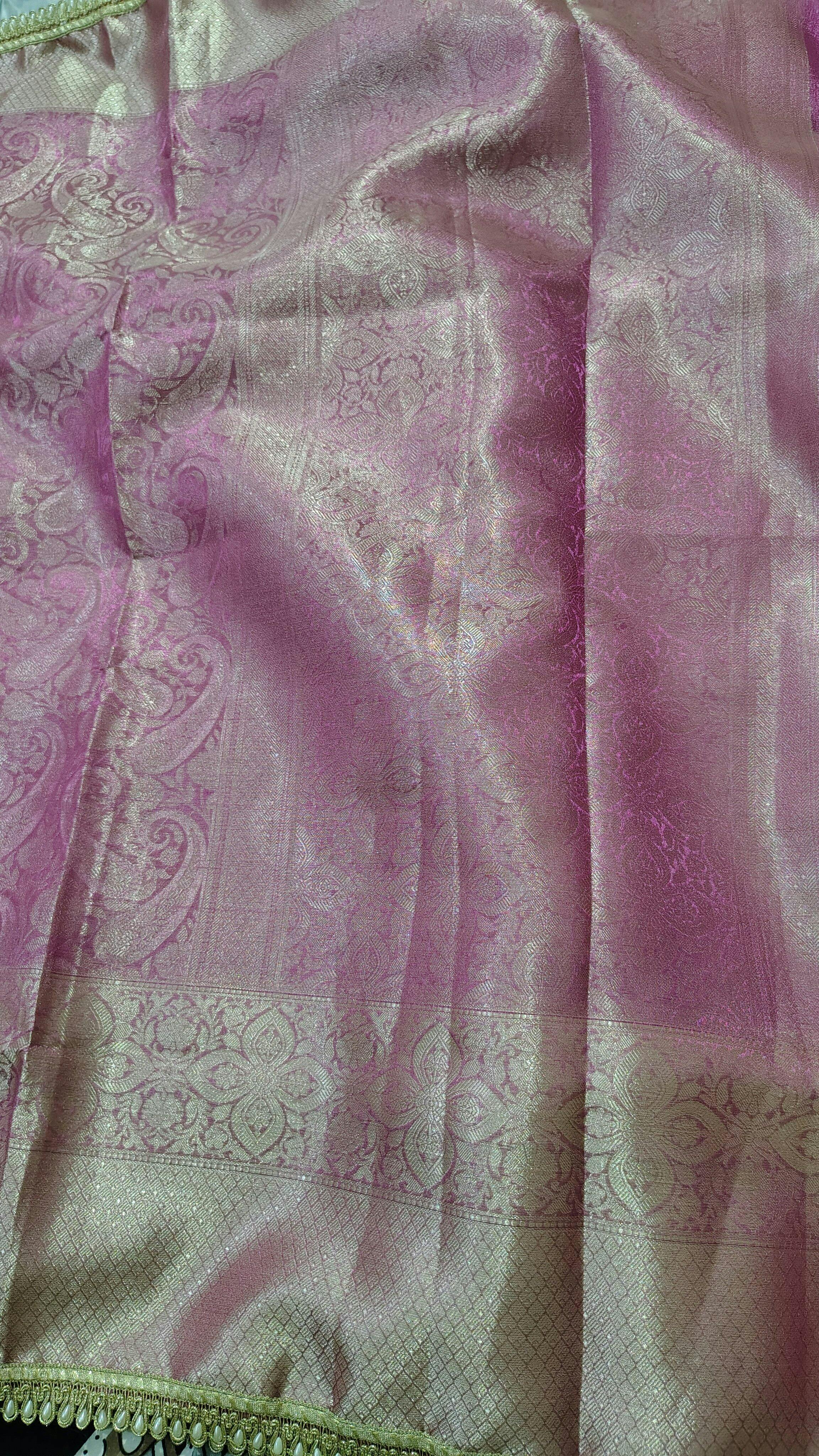 The Pink Glass Tissue Silk Banarasi Saree blends delicate shimmer with refined lace detailing for a design that’s both festive and graceful. Woven from glass tissue silk, the saree offers a soft, reflective sheen that complements every light, ideal for daytime ceremonies and evening galas. A striking lace border adds structured elegance, contrasting beautifully with the fluid drape and boosting visual appeal.