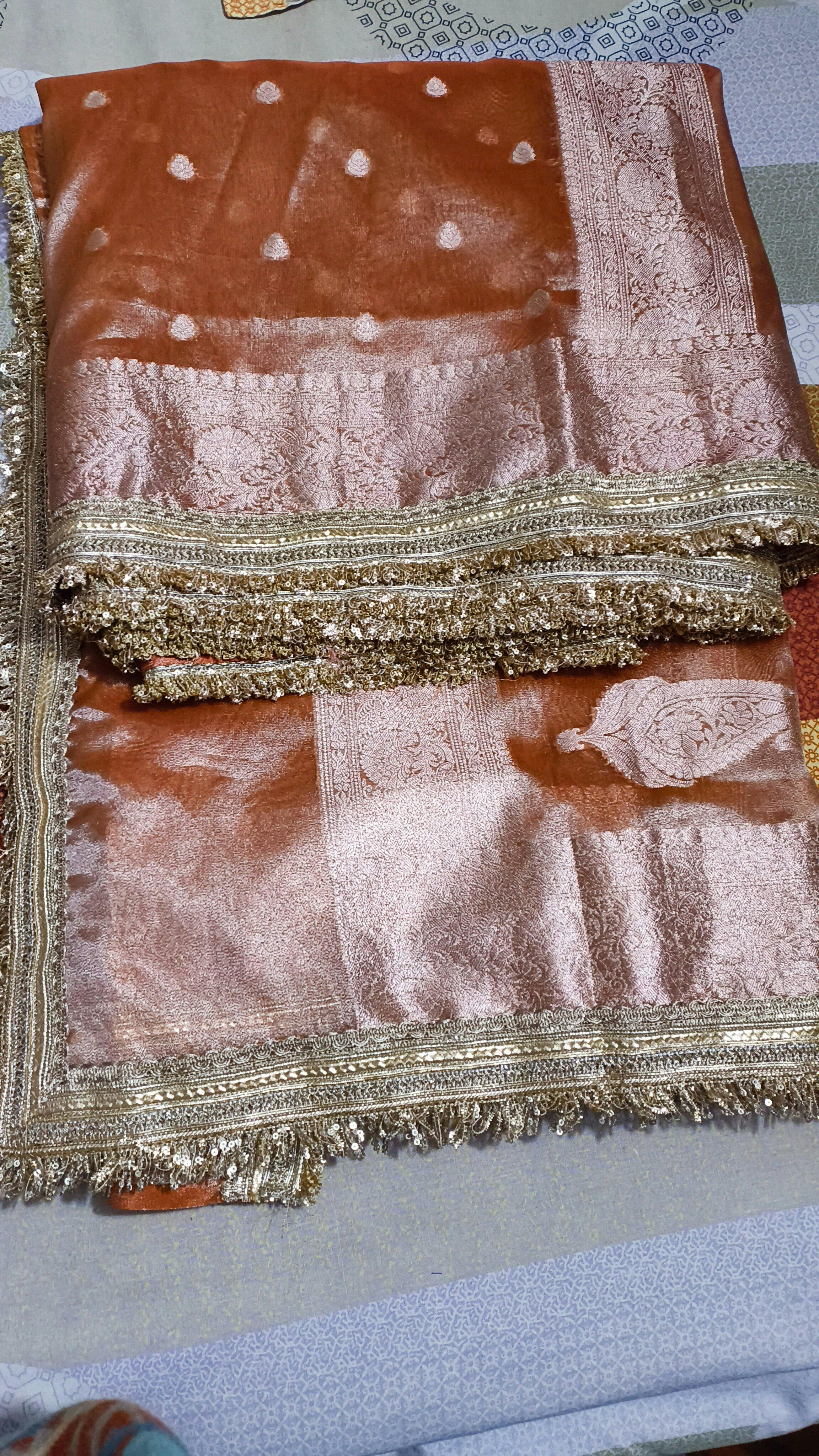 Rust Orange Tissue Silk Lace Attached Banarasi Saree