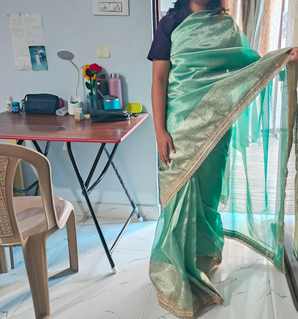This sea green Banarasi saree showcases premium tissue silk with meticulously crafted designer lace embellishments. The sophisticated color palette and refined detailing make it an exceptional choice for formal celebrations. A masterpiece of traditional weaving excellence.